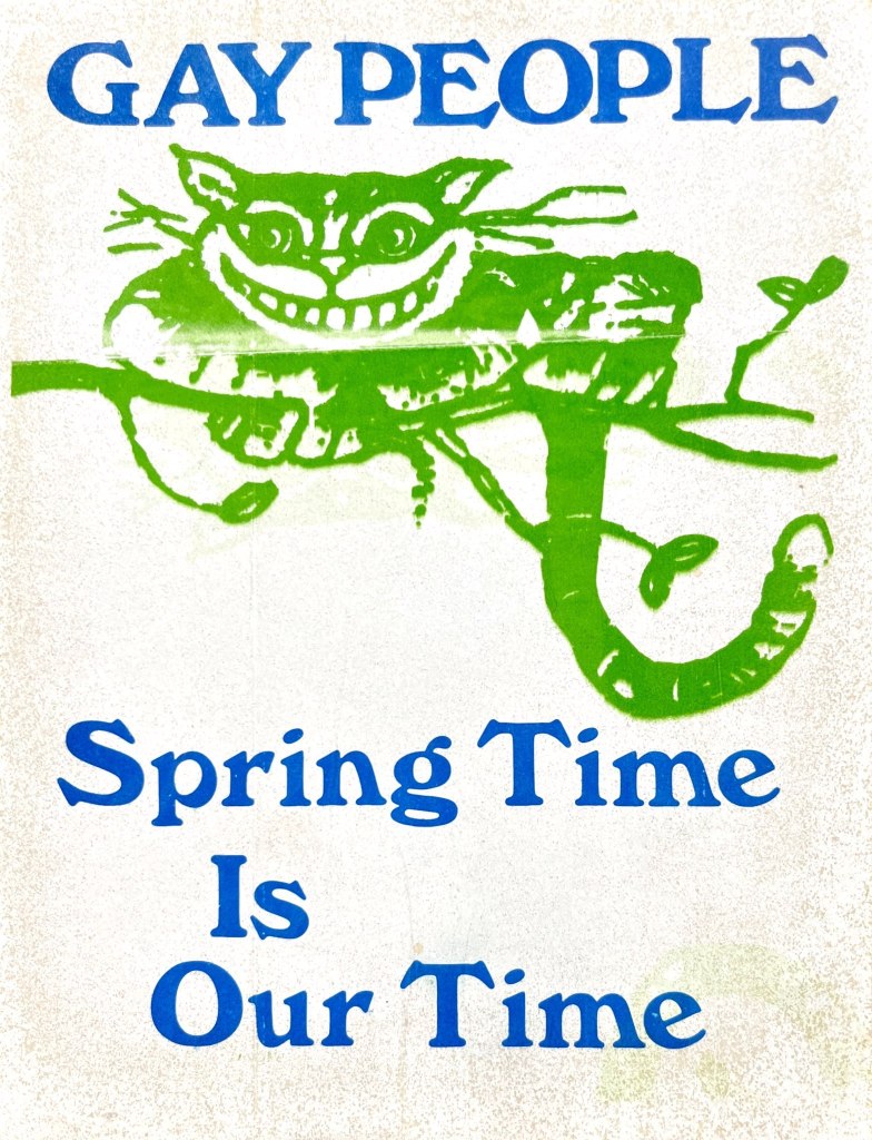 Michael said the stickers were put on telephone poles for fun and consciousness-raising on Davie Street in Vancouver. Another version had: “SMILE if you’re GAY” with the same Cheshire Cat. Well, we’re stuck on history.