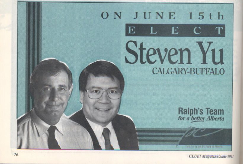 Elect Steven YuDespite the dodgy comments from PCs about human rights, they cagily advertised in Calgary’s gay press for their candidate, Stephen Yu, in Calgary Buffalo, long considered the queerest riding in the city (he came in 2nd, taking 40% of the vote).