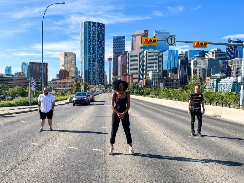 Artists Cory Bugden, Sydonne Warren, and Tyler Lemermeyer stopping traffic on Centre Street.