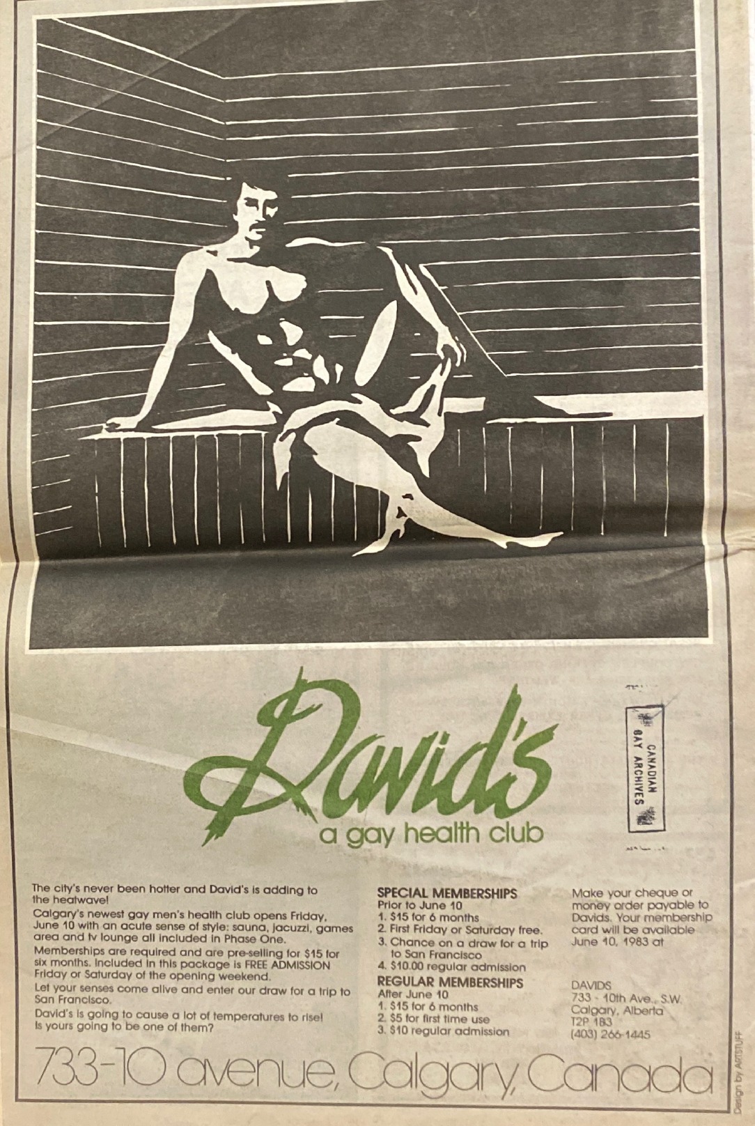 Last week, Kristopher and the Edmonton Queer History Project shared this Calgary advertisement which they discovered in the May 1983 issue of Fine Print in Edmonton. David’s was a gay bathhouse that opened that summer in the building which now houses Commonwealth Bar and Stage. David’s was located in the basement and later became the Underground Pub as part of The Warehouse nightclub upstairs. Calgary had three bathhouses at the time. Anecdotally, Stampede was one of the busiest (and hottest, to borrow from their ad-copy) times of the year. Yahoo!