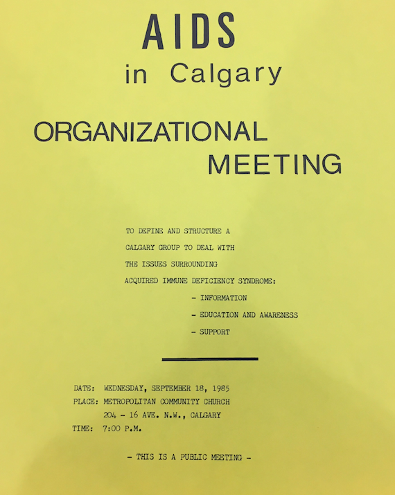 The first meetings for what was to become AIDS Calgary began in September 1985. Doug Young, a gay activist and community organizer collected papers from those early meetings, which can be found at the Glenbow Archives. Sadly, he himself died of AIDS in 1994.